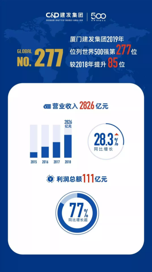 北京时间7月22日,《财富》杂志发布2019世界500强榜单,建发集团跃居第277位,较2018年上升85位。排名背后,是不断提升的运营效率和经营质量。2018年,建发集团实现营业收入2826亿元,同比增长28.3%;利润总额111亿元,同比增长超过77%。