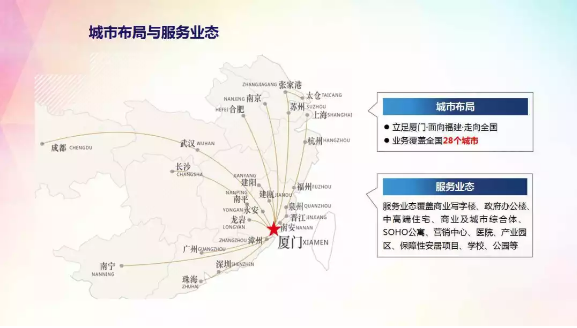建发物业始于1995年,系建发房产旗下专业从事物业管理的集团公司,遵循“立足厦门、面向福建、辐射全国”的发展战略,建发物业的项目版图不断扩大,所辖区域辐射28个城市,在管项目逾178个,管理面积近3000万平方米,服务类型覆盖写字楼/办公楼、住宅、城市综合体、商业、医院、产业园区、学校、公园等公共配套项目,提供物业前期介入、物业顾问服务、物业全委管理、物业资产管理、物业增值服务等物业项目全生命周期服务。