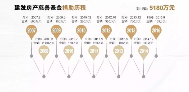 2007年,建发房产慈善基金成立,秉承"有爱就有路"的理念,目前已累计向该基金捐赠了5180万元,资助贫困大学生超过5500人,资助贫困家庭超过2500户,希望为每一个有梦想的奋斗者插上翱翔的翅膀。除此之外,在2008年四川汶川地震、2010年青海玉树地震及2013年四川雅安地震后,向灾区捐款总计2300多万元,积极投身灾后重建工作。